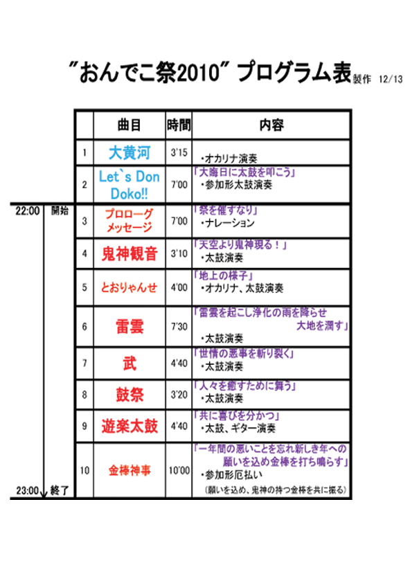 おんでこ祭2010プログラム決定!!活動告知 2010.12.16みなさんお初になりますリーダーです今年も早いものであと半月になりましたね。(ほんと一年はあっという間です)我が家はそろそろ大掃除の準備に取り掛かっていますがみなさんはいかがお過ごしでしょうか?さて、遅ればせながらおんでこ祭プログラムが出来上がりましたのでご覧ください。出来たてホヤホヤです