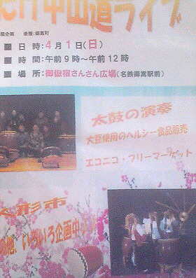 みたけ中山道ライブ 出演決定!!活動告知 2012.03.20鬼神太鼓の厳選した(団員の都合が合っただけ)つぎなるステージはここだ!『みたけ中山道ライブ』日時:4月1日(日)内容:出店等の出店。 他にもステージイベントあり。 御嶽町薬師祭礼。「大寺山願興寺」の祭礼。 入場無料。演奏時間:09:30~10:30演奏場所:御嶽宿さんさん広場(名鉄御嵩駅前)演奏内容:鬼神登場!