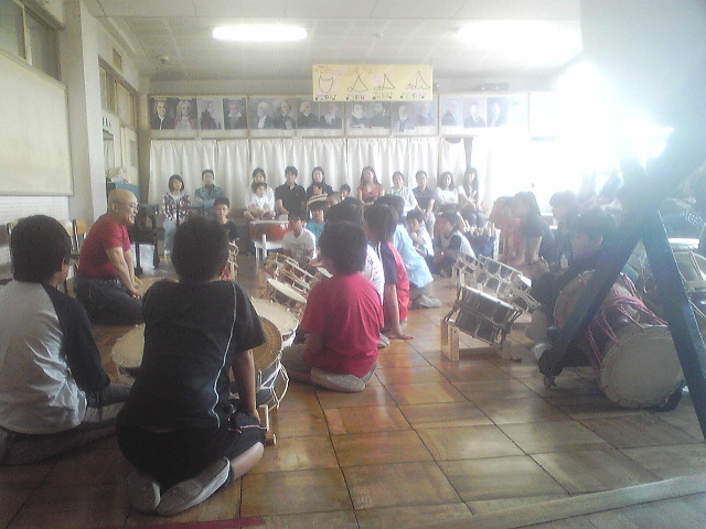 犬山市立楽田小学校太鼓体験 出演報告!!活動報告 2012.06.02鬼神である。今回は小学6年生に、将来立派な鬼神になるべく太鼓体験会を行った。こわっぱどもは音楽室に並んだ太鼓の量と大きさに、「おーっ」「すげー」など歓声をあげておった。グフフ…。太鼓を運んだ先生方や子供達は苦労したであろう…。喝-----!!さ-太鼓を叩け!!目をむけ!角を生やし牙をむけ!鼻の穴を広げい!!もっと広げい!むけい!『犬山市立楽田小学校太鼓体験』日時:6月2日 10:30~場所:犬山市立楽田小学校