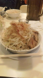 トッピングに野菜をつけるのがこの店のならわしらしい。量はちょい増し、増し、増々、バカ増しと選ぶことができる。バカ増しを頼めば面白そうだか少食な朕は増しを選択。