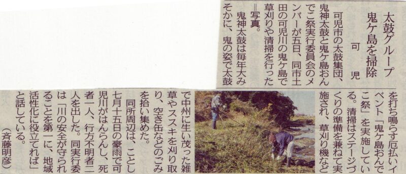 鬼ヶ島(可児川)草刈り無事終了!活動報告 2010.12.01鬼ヶ島清掃、無事終わりました!今年は豪雨もあり、たった一年で地形が大きく変化していました。岩に巻いてあったしめ繩や、権現・雷神が彫刻された石が流されてしまいました。石や木も流され岩は剥き出しになっていました。自然の猛威には畏れ祈るばかりです。