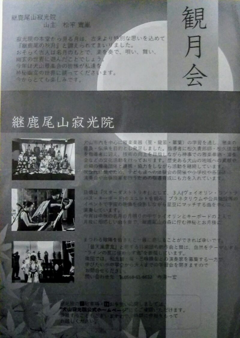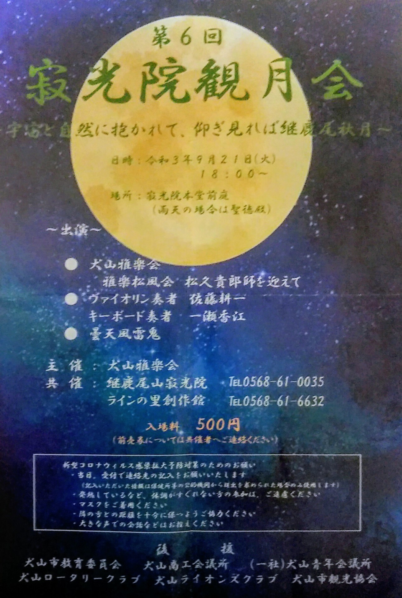 10月30日犬山寂光院観月会活動告知 2021.10.07雅楽、バイオリン、太鼓で彩る夜。是非お越しください。しかし、鬼神様は10分程しか現れない超貴重な存在である。テーマ:自然の神秘とその恩恵日 時:10月30日土曜日14:00~16:00場 所:寂光院聖徳殿入場料500円コロナ禍により日時が変更になりました。